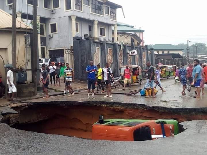 Home / Home / Abia road parts into two after yesterday’s rain with a car tucked right inside (shocking photos)