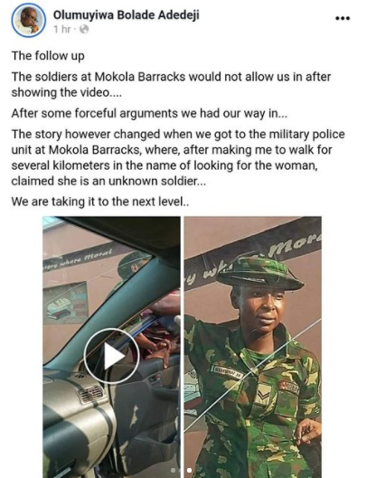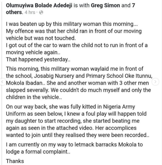 This morning, this military woman waylaid me in front of the school, Josabig Nursery and Primary School Oke Itunnu, Mokola Ibadan.. She and another woman with 3 other men slapped severally. We couldn’t do much myself and only the children in the vehicle..