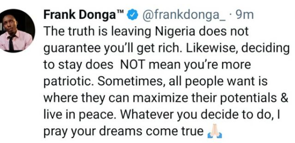 ”The truth is leaving Nigeria does not guarantee you’ll get rich. Likewise, deciding to stay does NOT mean you’re more patriotic. Sometimes, all people want is where they can maximize their potentials & live in peace. Whatever you decide to do, I pray your dreams come true”, he wrote.