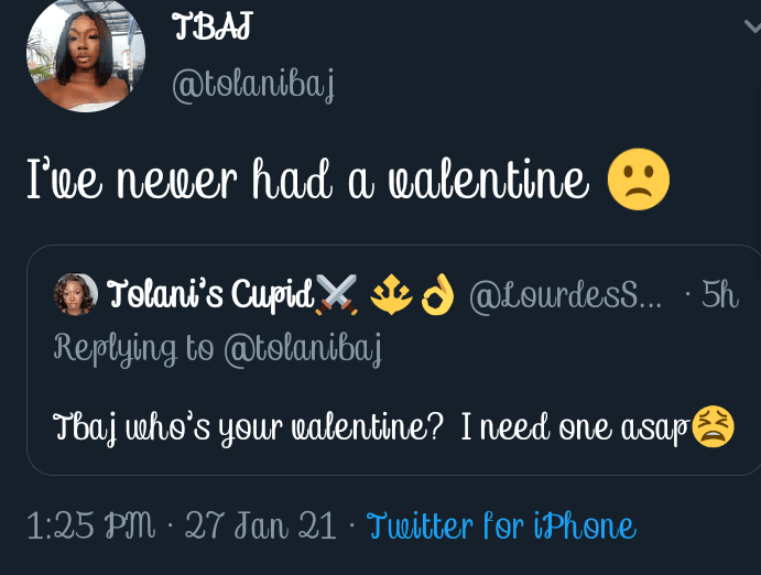 Ex-BBN housemate, Tolani Baj has revealed she has never celebrated Valentine before.