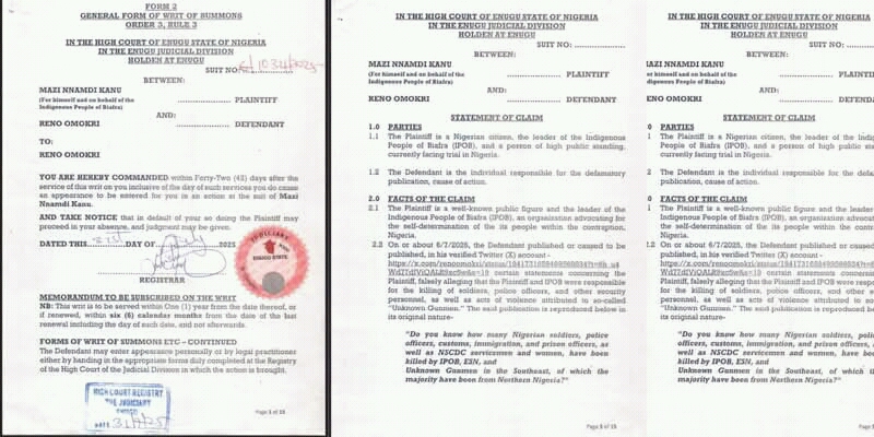 He informed the court that “On or about 6/7/2025, the Defendant published or caused to be published, in his verified Twitter (X) account -https://x.com/renoomokri/status/1941731659499569534?t=6h Wd77dIViOALR9xc5w&s=19 certain statements concerning the Plaintiff, falsely alleging that the Plaintiff and IPOB were responsible for the killing of soldiers, police officers, and other security personnel, as well as acts of violence attributed to so-called “Unknown Gunmen.” The said publication is reproduced below in its original nature-
