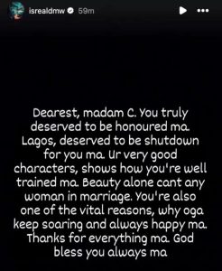 “Dearest, madam C. you truly deserved to be honoured ma. Lagos, deserved to be shutdown for you ma. Ur very good characters, shows how you’re well trained ma.