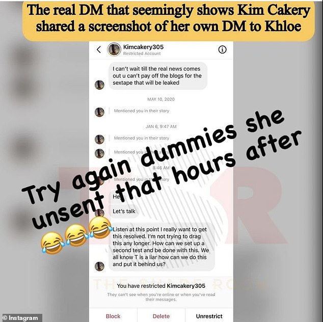 On Monday, Kimberly Alexander – also known as Kim Cakery – shared a screenshot of what she alleged to be a message from Khloe, 36, regarding ongoing allegations that she shared a love child with the love rat basketball player.