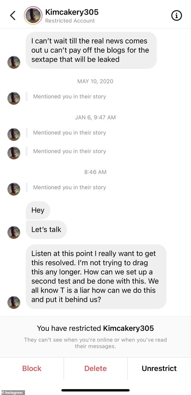 The new screenshot seen by DailyMail.com shows Alexander sending Kardashian a message seemingly threatening to release a sex tape between her and Thompson that was sent sometime prior to May 10, 2020.