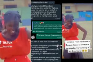 A lady has received a break up text from her partner, after she acted as a witch in her university’s Yoruba Awareness Day drama.