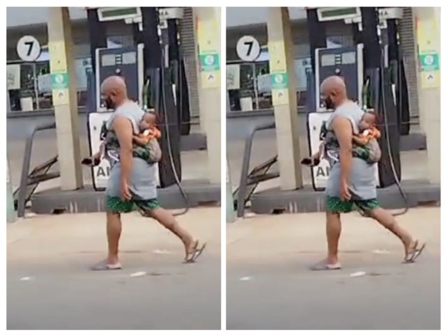 The video has since gone viral, with many viewers celebrating the father’s hands-on approach to parenting, while a few others offered criticism. Despite curious glances from passersby, the man remained cheerful, even waving at someone off-camera, unfazed by the attention.