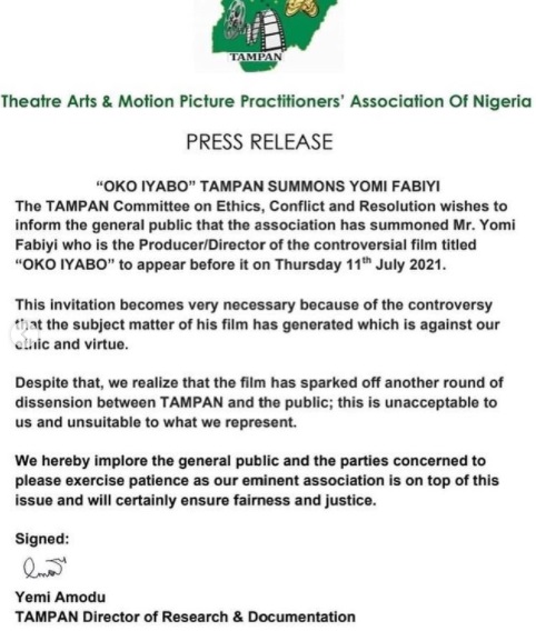 According to the press release by TAMPAN, the body has summoned the producer and director of the movie, Yomi Fabiyi to appear before the committee on 11th of July, 2021.