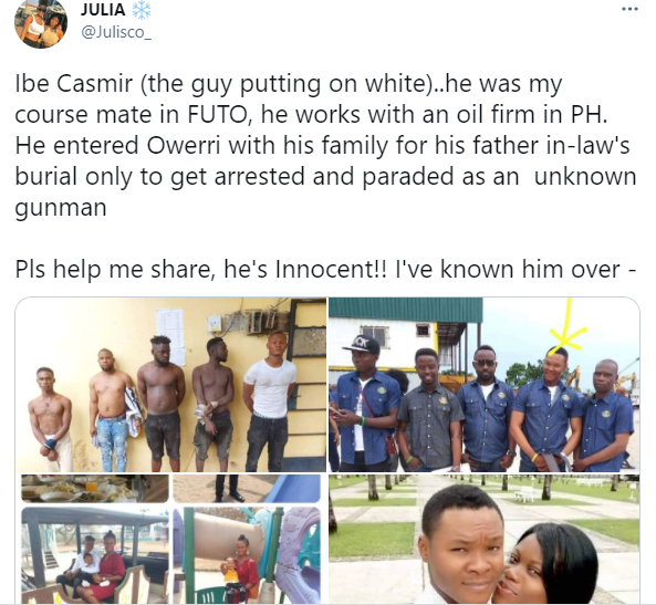 ”Ibe Casmir (the guy putting on white)..he was my course mate in FUTO, he works with an oil firm in PH. He entered Owerri with his family for his father in-law’s burial only to get arrested and paraded as an unknown gunman