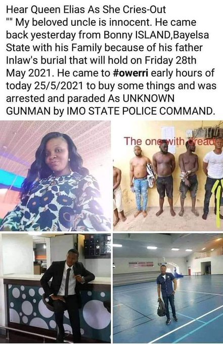 There’s an outcry on social media since a lady — @Julisco_ shared a story of how a man entered Owerri for the burial of his father in-law scheduled to hold this Friday, May 28th but was allegedly arrested by Imo state policemen and paraded as UNKNOWN GUNMAN.