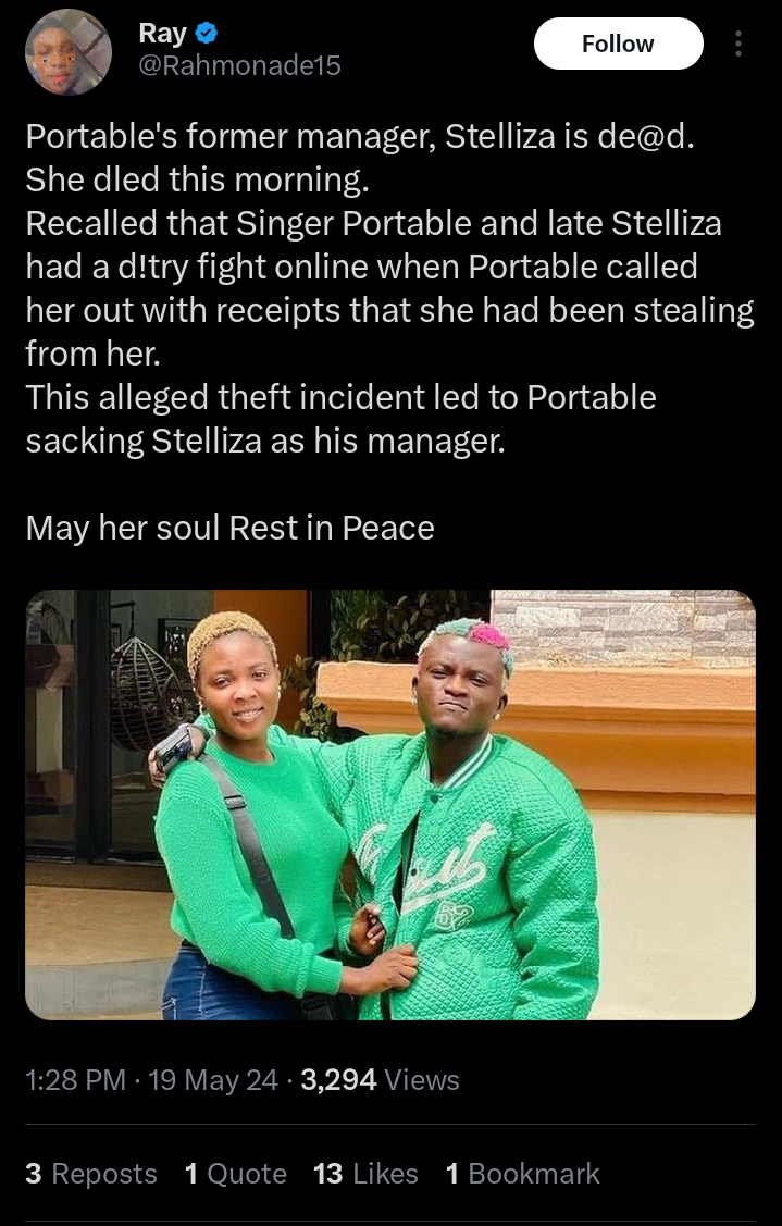 Former Portable’s manager, Stelliza, is reportedly d3ad, as read from a social media user.