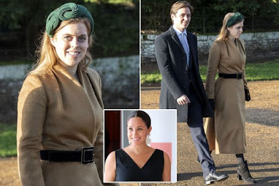 Beatrice wore a smart tan coat with a green headband and black boots and gloves for the Christmas service, while Edo looked smart in a black suit with a grey tie.