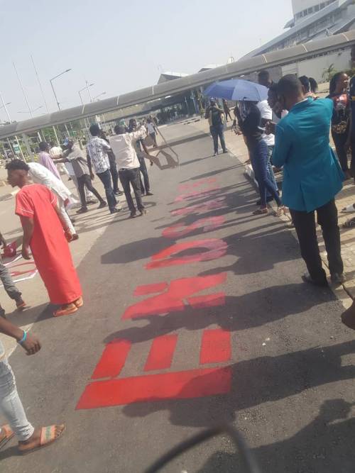Nigerian youth calling for an end to police brutality and extrajudicial killings in the country on Sunday stormed the Nnamdi Azikwe International Airport, Abuja, to paint #ENDSARS on the floor of the facility’s entrance.