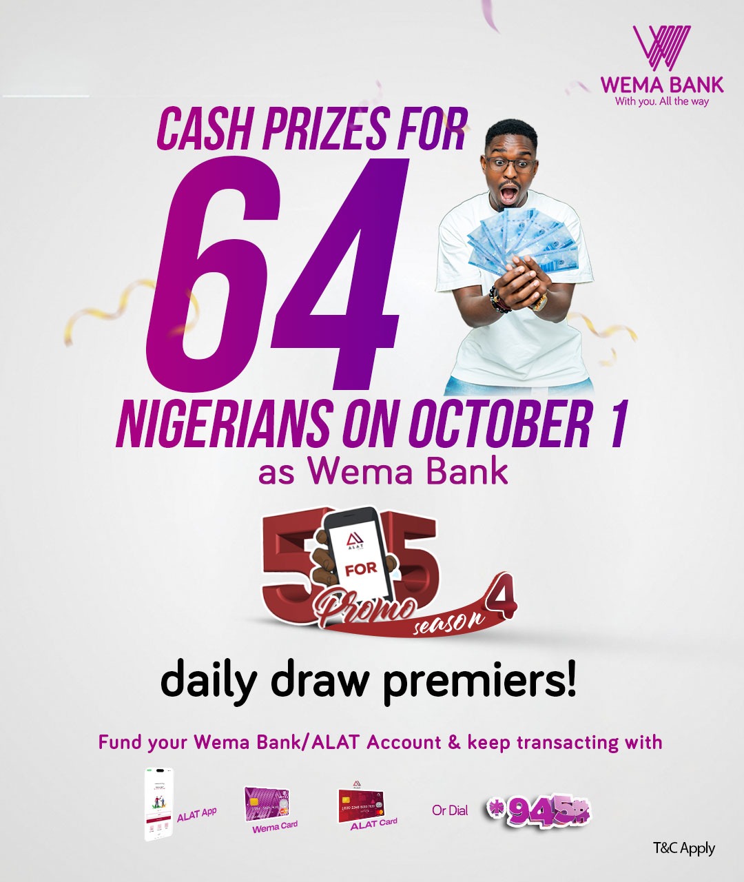 With N135,000,000 set to be disbursed in daily, weekly and monthly draws, including a special grand prize of N5,000,000, the Wema Bank 5 for 5 Promo Season 4 promises to be a game changer, and every Nigerian can participate by funding their Wema/ALAT accounts and transacting frequently using ALAT, *945# or Wema/ALAT card.