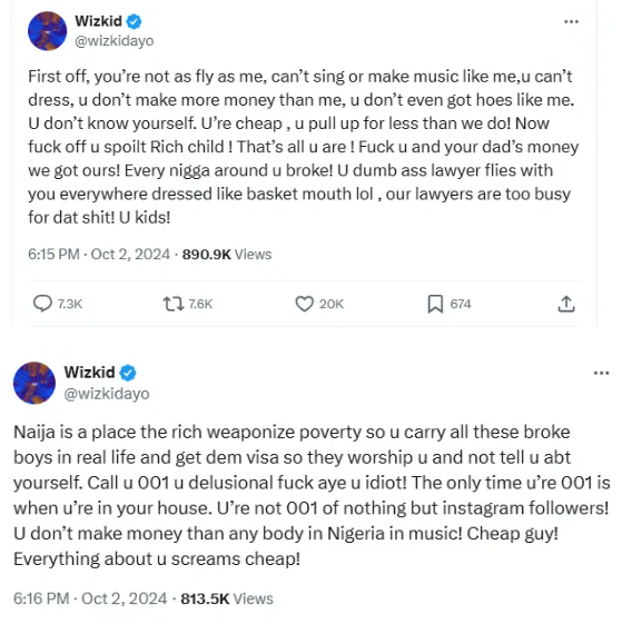 “First off, you’re not as fly as me, can’t sing or make music like me, u can’t dress, u don’t make more money than me, u don’t even got hoes like me. U don’t know yourself. U’re cheap, u pull up for less than we do! Now fuck off, u spoilt rich child! That’s all u are! Fuck u and your dad’s money, we got ours! Every nigga around u broke! U dumb ass lawyer flies with you everywhere dressed like basket mouth lol, our lawyers are too busy for dat shit! U kids!